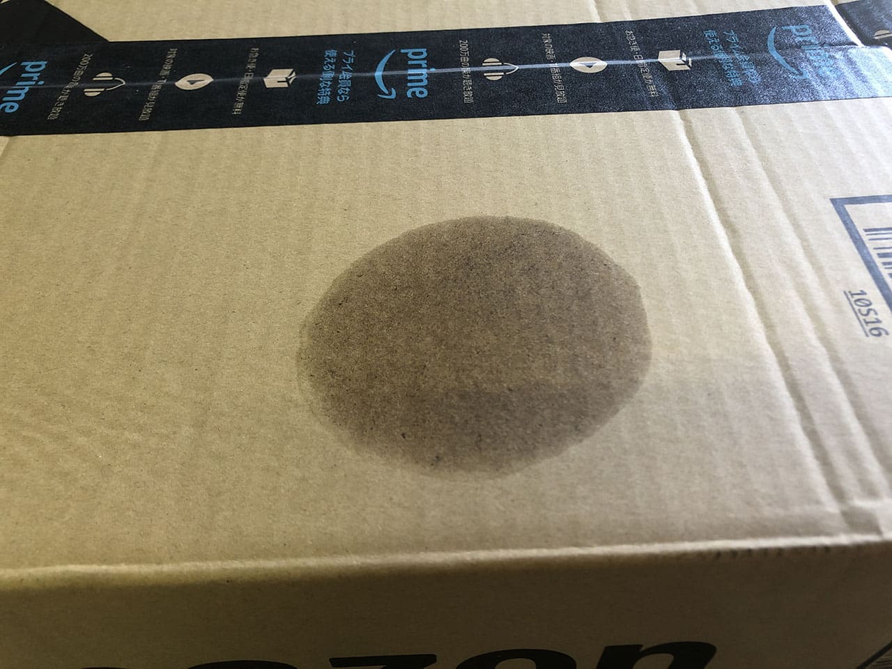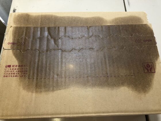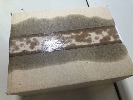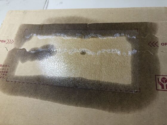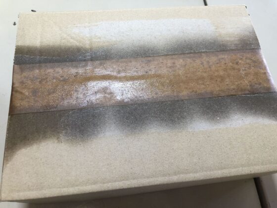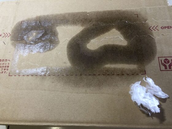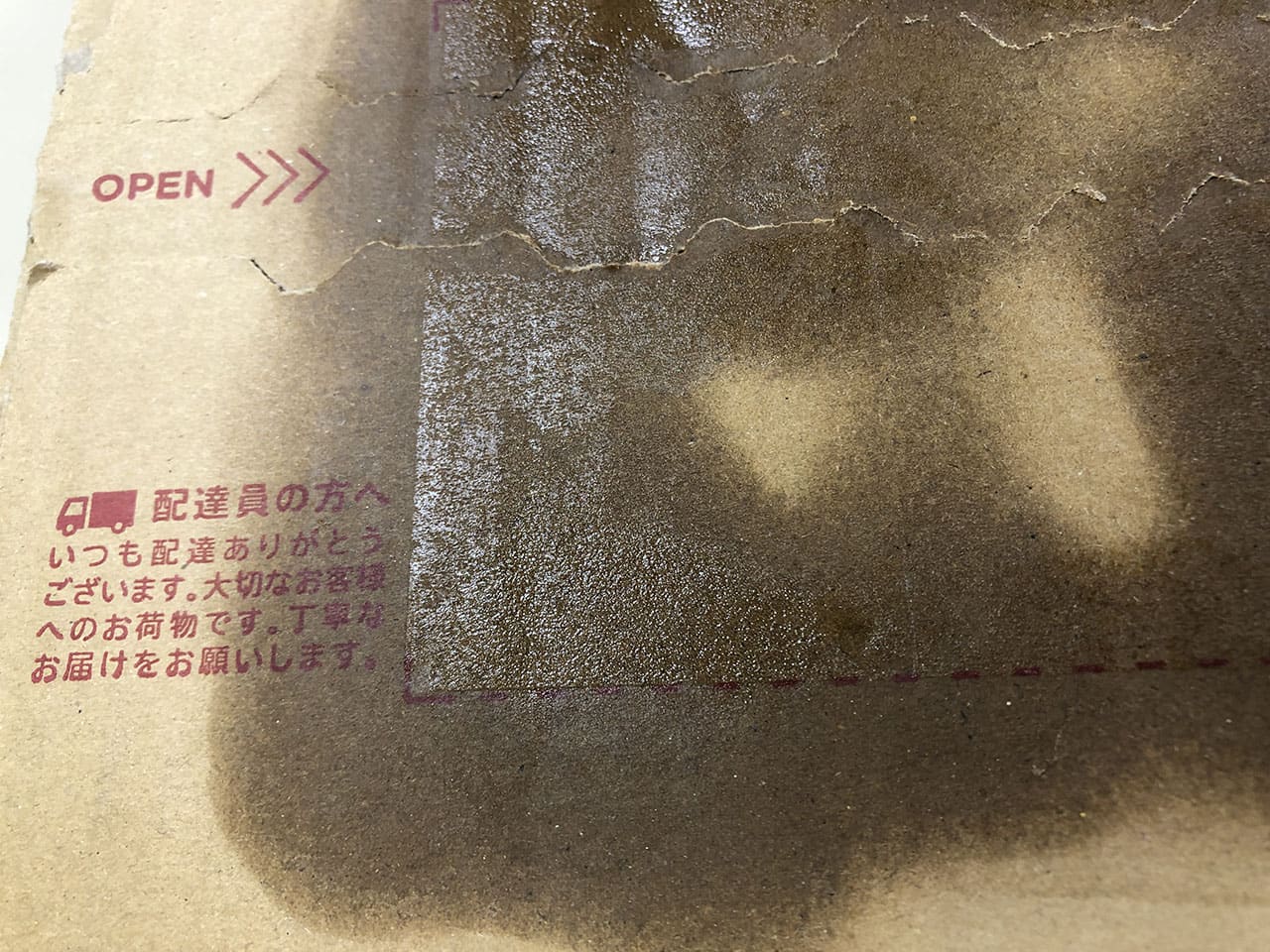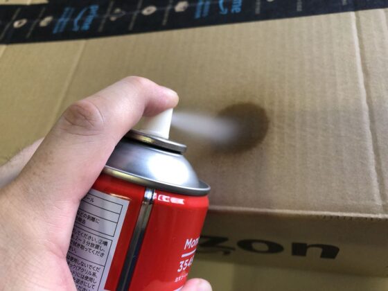色の差が出るなら、いっそのこと箱全体に吹きかけてシミとそれ以外の場所の差を無くすという手もありますが、そのかわり、量を使うのと、ダンボール全体の色が濃くなるのと、貼ってあるテープ全てが剥がれてしまいますけどw
