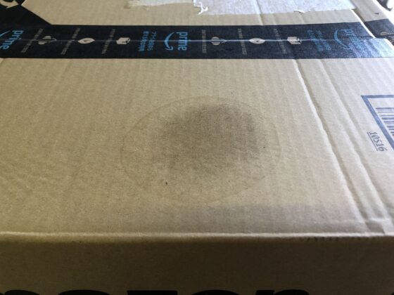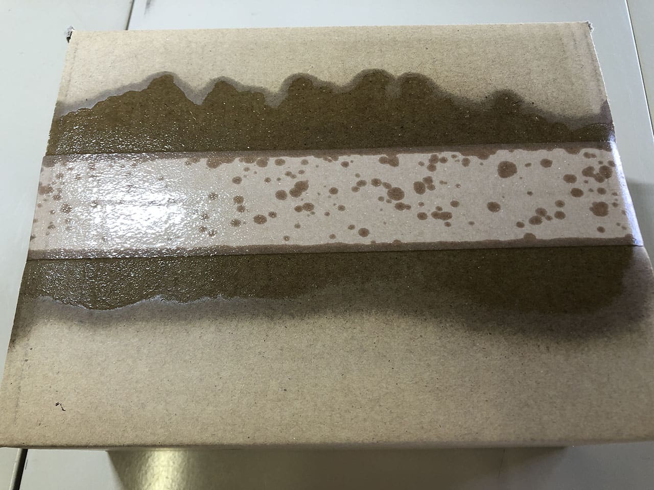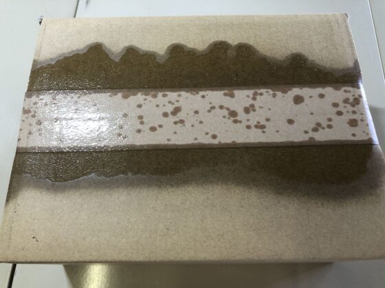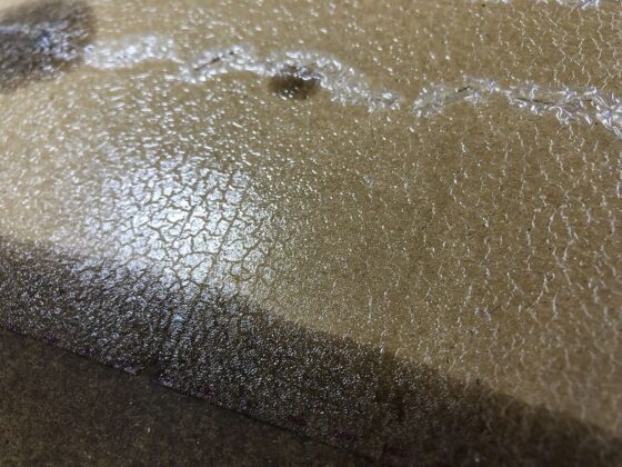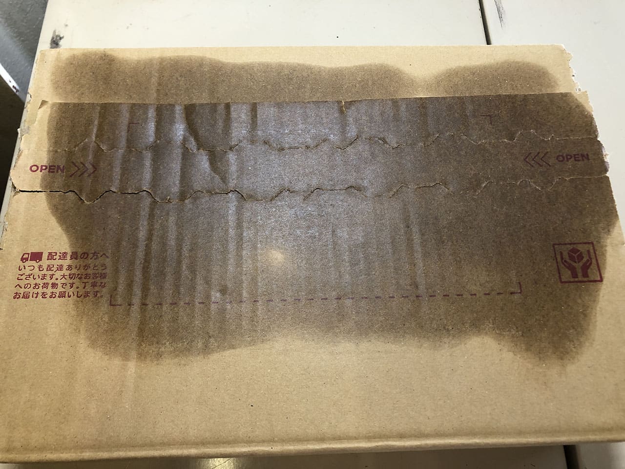 色の差が出るなら、いっそのこと箱全体に吹きかけてシミとそれ以外の場所の差を無くすという手もありますが、そのかわり、量を使うのと、ダンボール全体の色が濃くなるのと、貼ってあるテープ全てが剥がれてしまいますけどw
