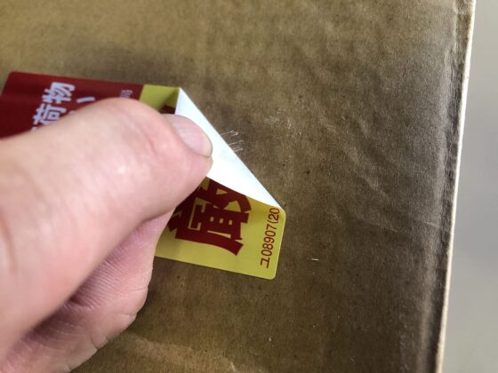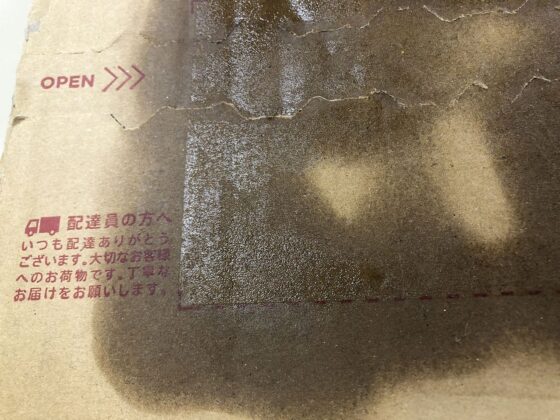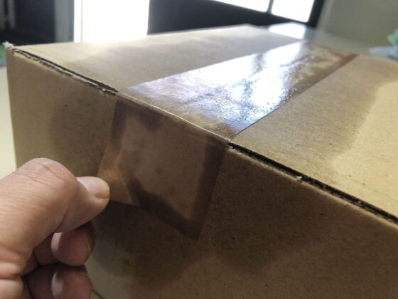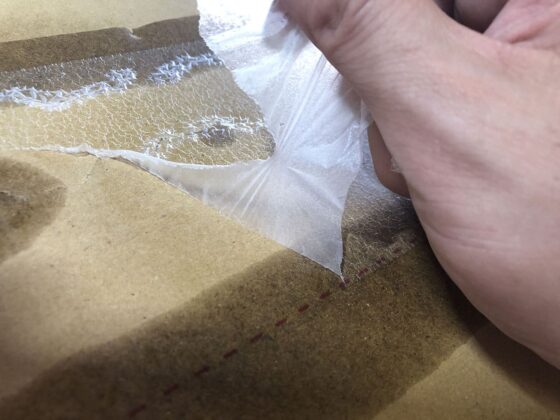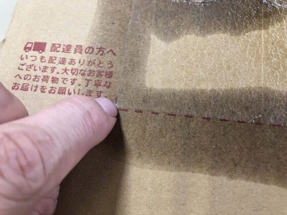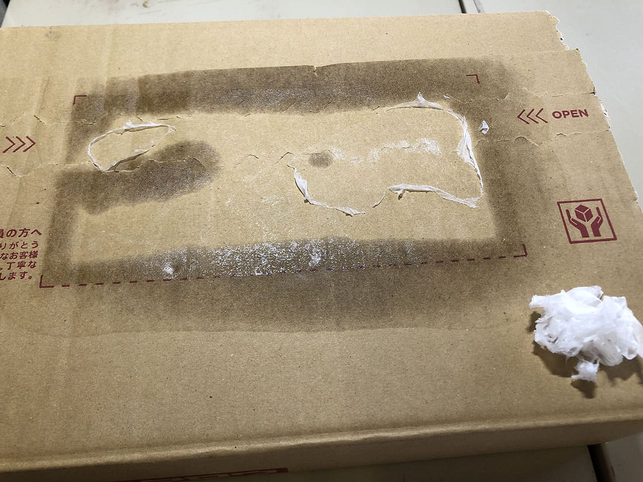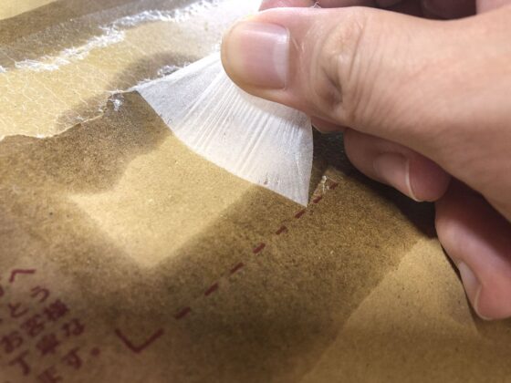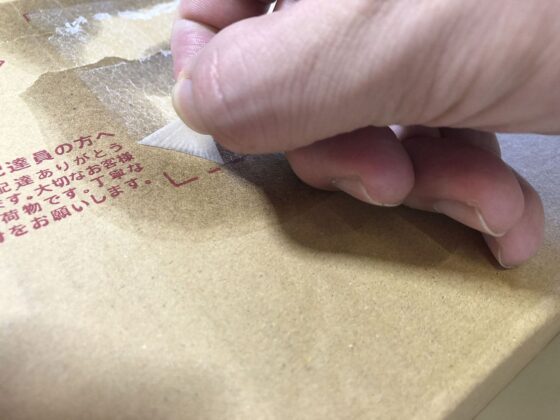 いつも剥がすのに難儀していた「送り状を剥がした後に残る半透明のフィルム的なもの」を剥がしてみましょう。