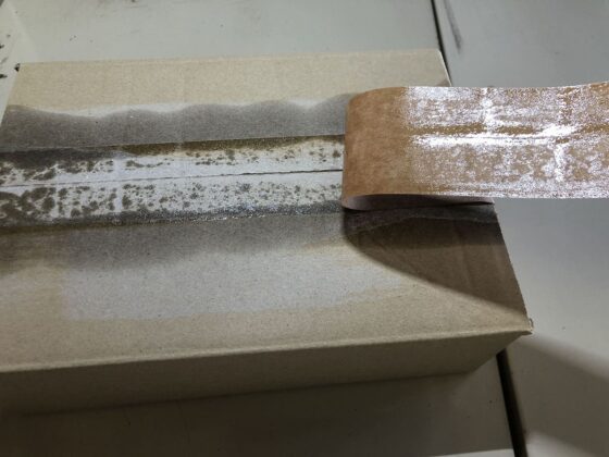 クラフトテープ(紙の粘着テープ)といっても表面が液剤を弾きやすいタイプなので、どこまでテープがキレイに剥がれるか試してみましょう。