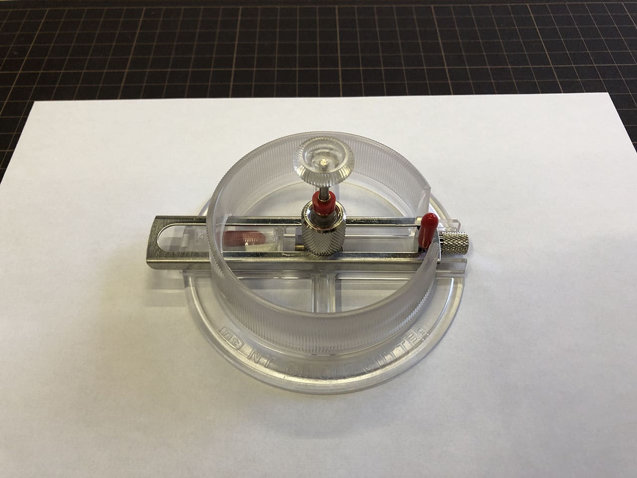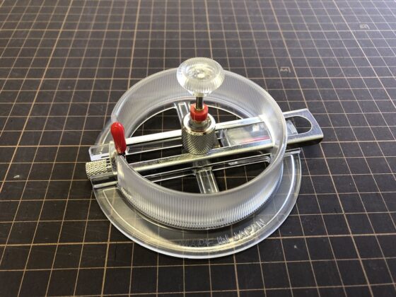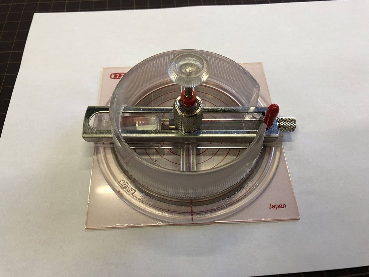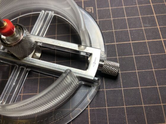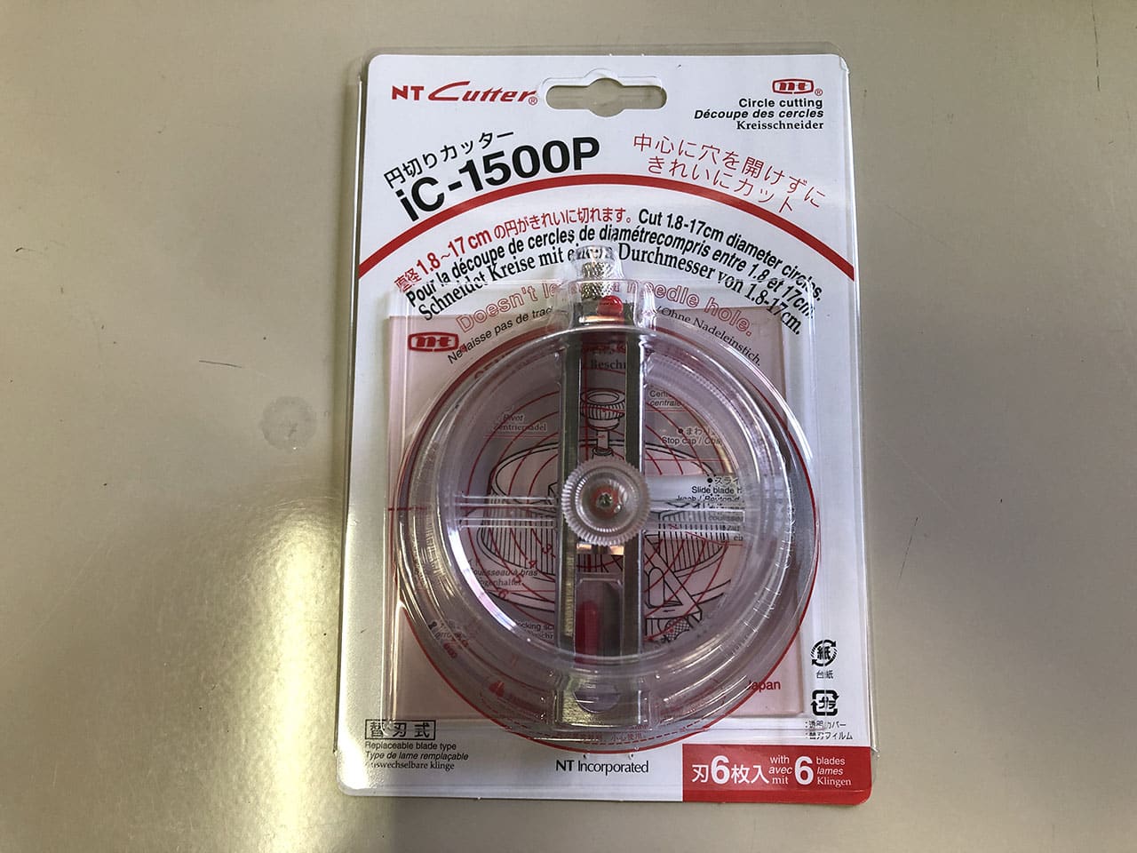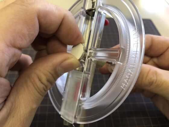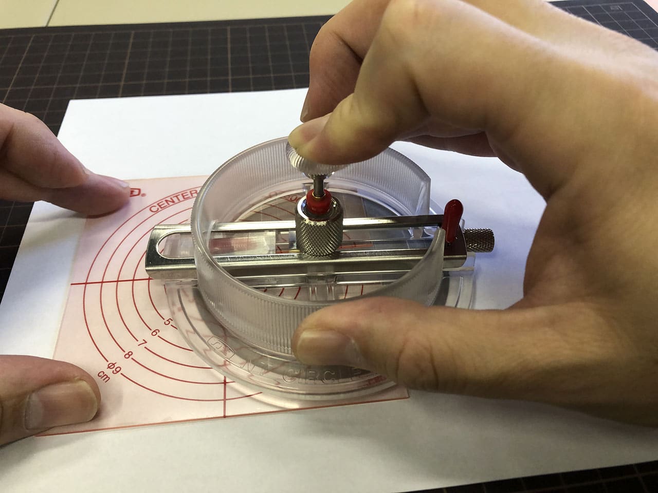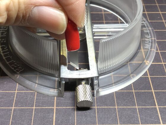 コンパス的なカッターだと中心に針の穴が開いてしまいますが、これは針の穴が開かないタイプのカッターです。