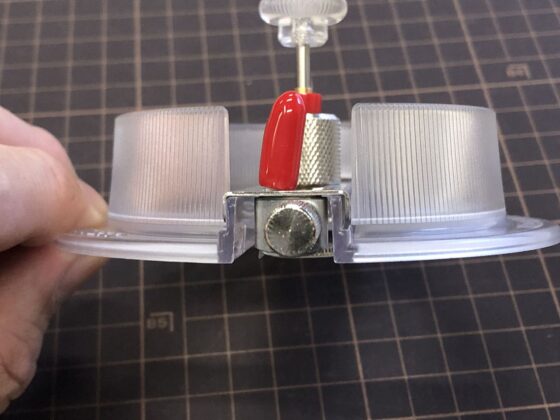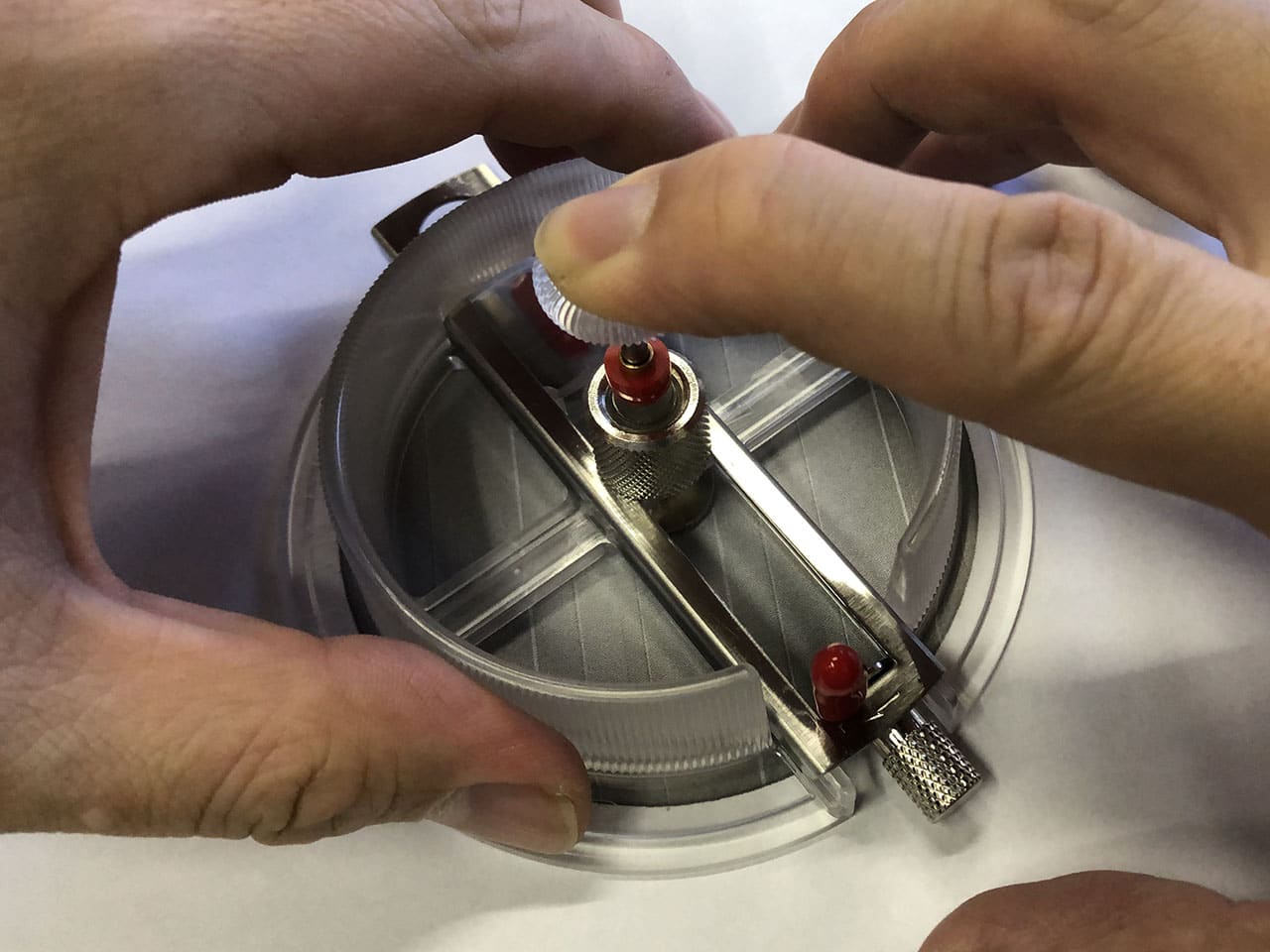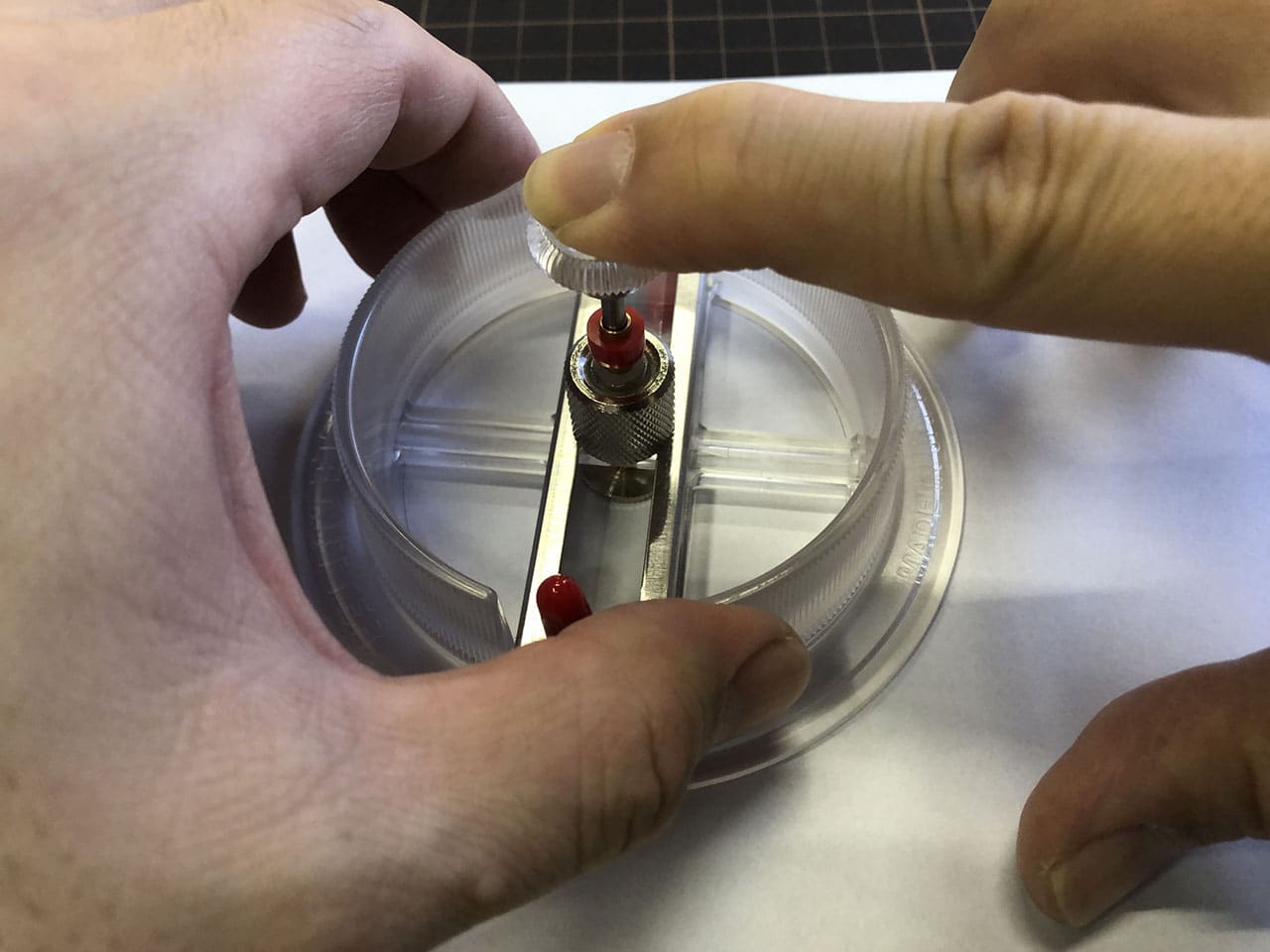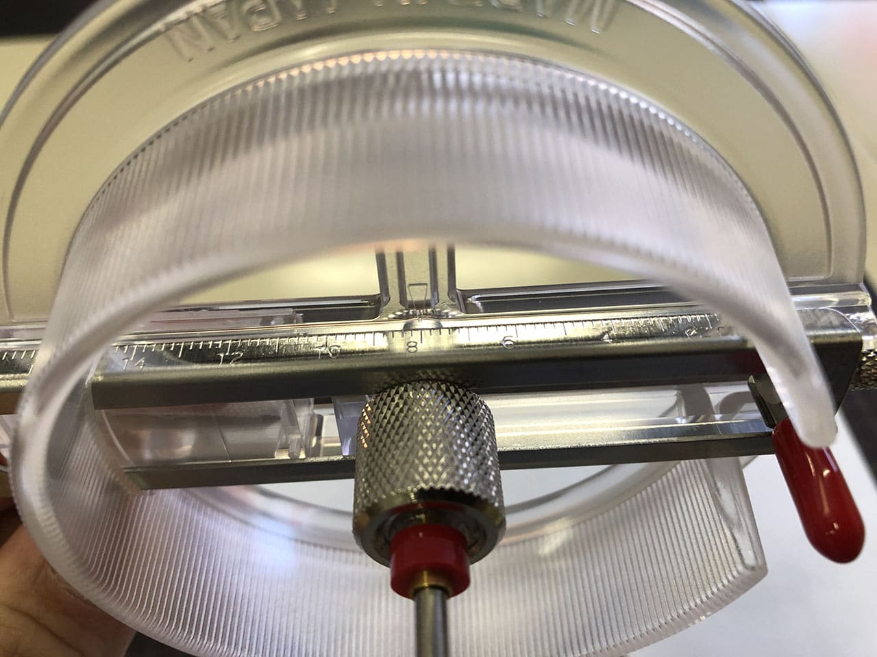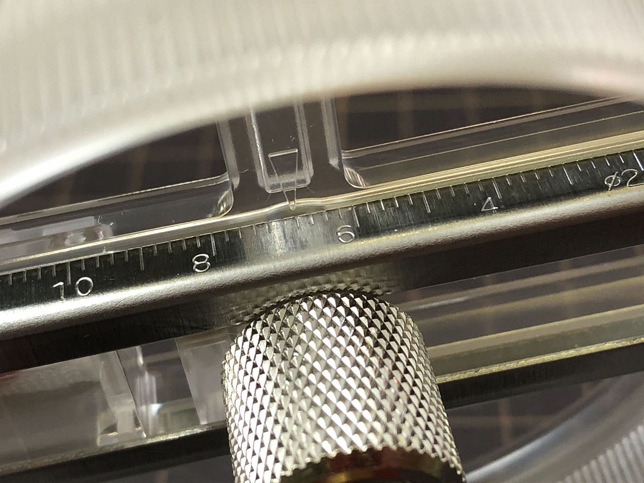 つまみを押さえつつ回す透明の部分を持ち上げてセンターゲージを抜き取ります