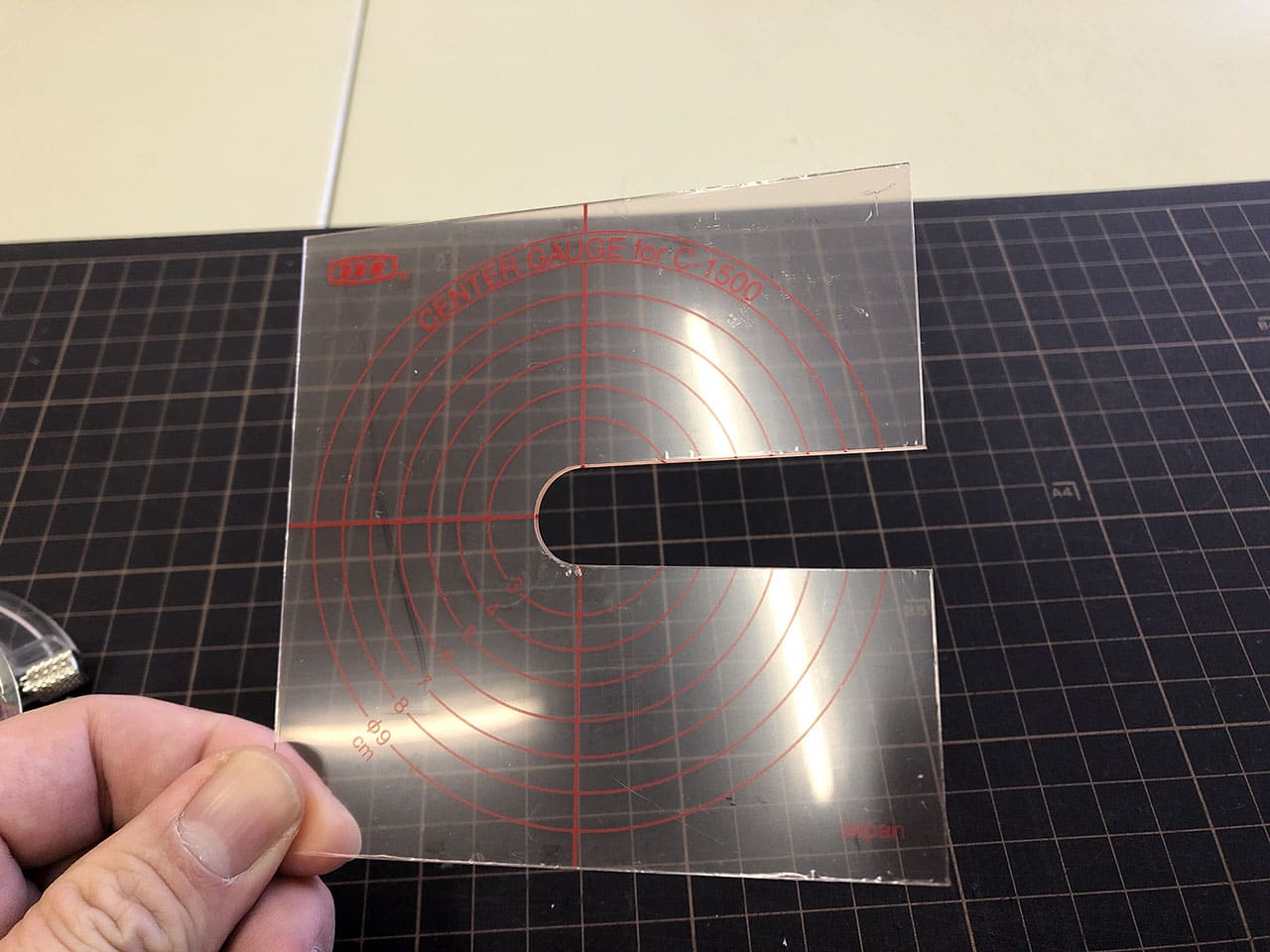 位置を決めて切ることもできるので、付属のセンターゲージを使って丸く印刷された部分を直径80mmで切り抜いてみます。