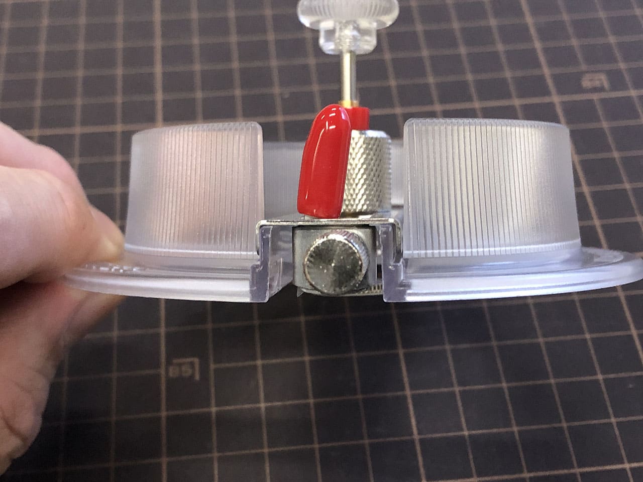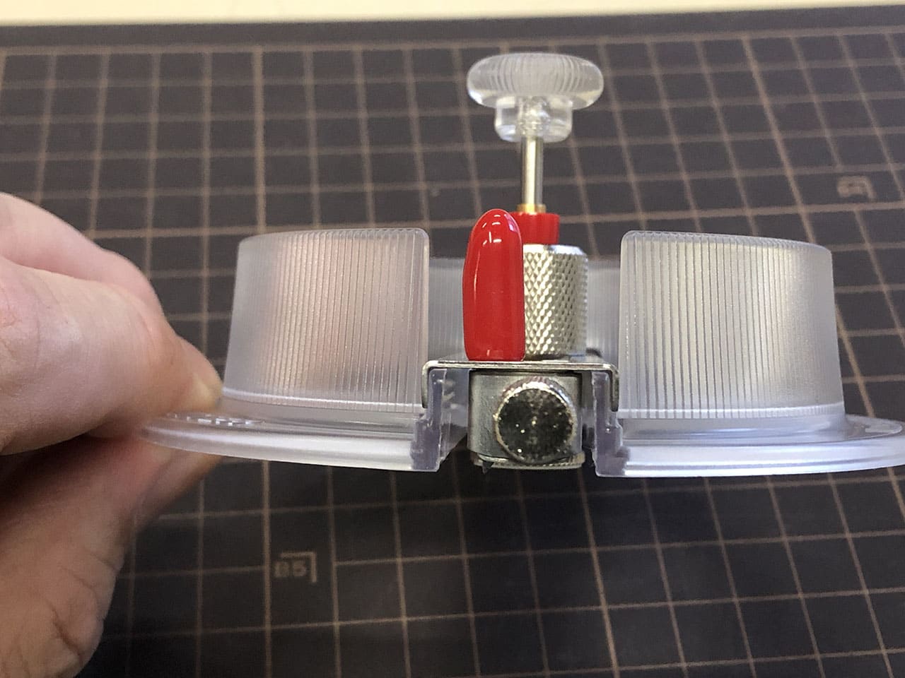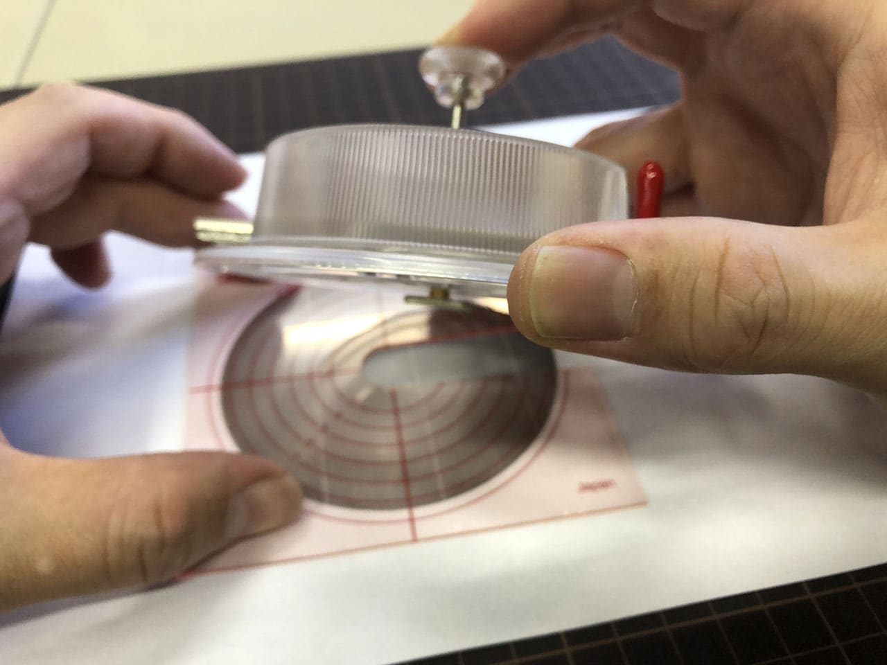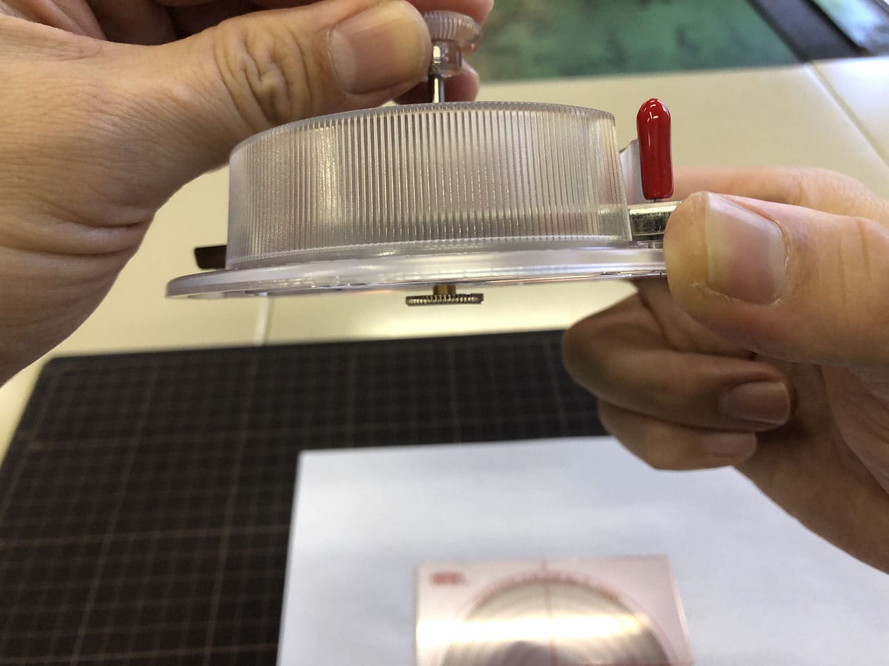中心がズレないようにしっかり押さえていれば回す透明の部分を持ち上げなくてもよさそうですが、実際にやってみると位置がズレやすかったので持ち上げながらセンターゲージを抜くようにしました。