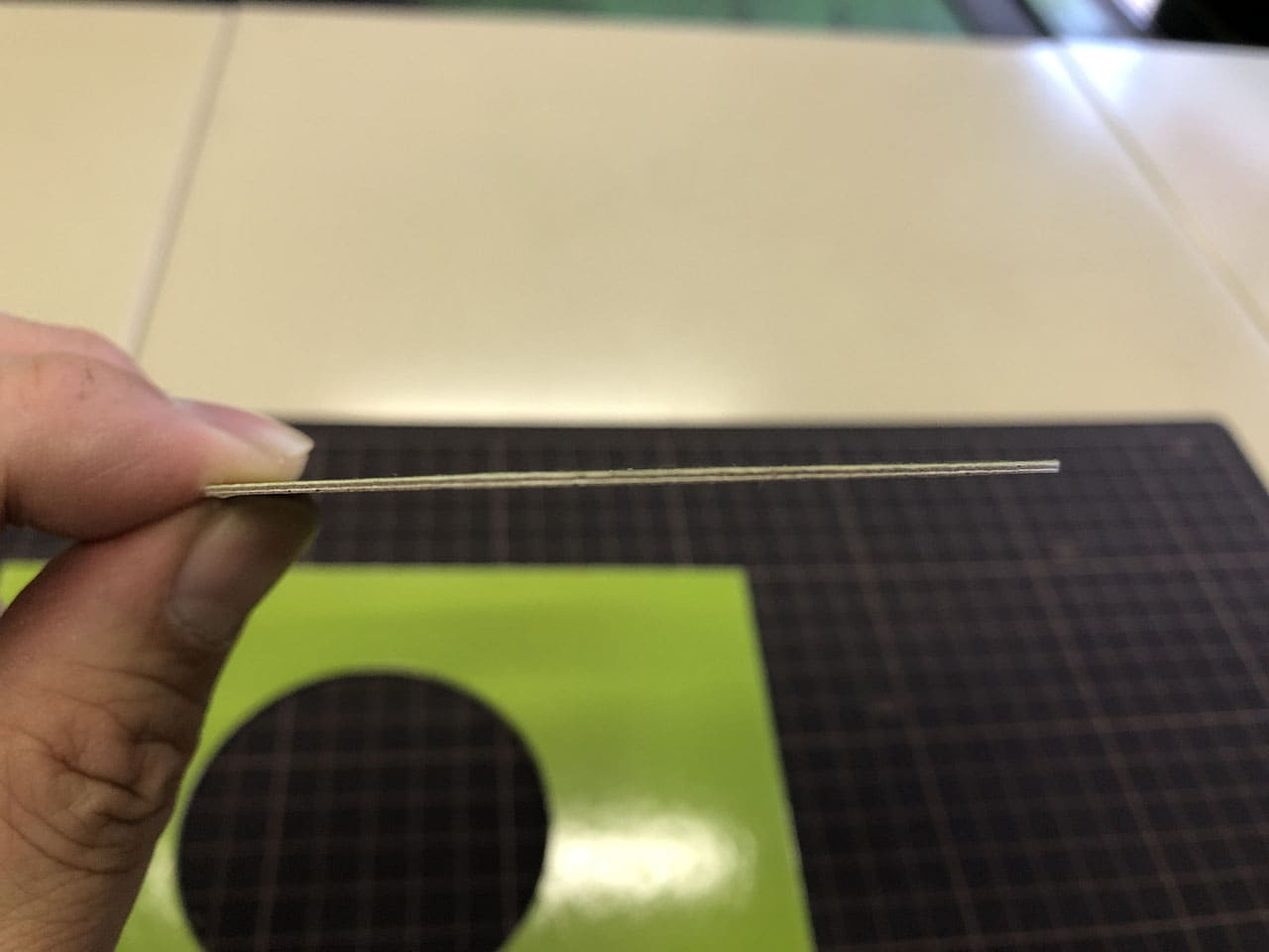 力をかけて(強く押さえつけて)切ると、エッジ部分にギザギザができるので、薄いものはまとめて切るより1枚ずつ切る方がキレイに切れそうです。