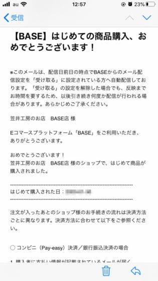 これはSTORESの場合でしたが、BASEでもおめでとうメールが届きます。