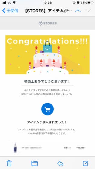 これはSTORESの場合でしたが、BASEでもおめでとうメールが届きます。