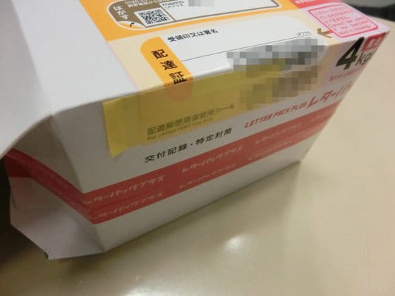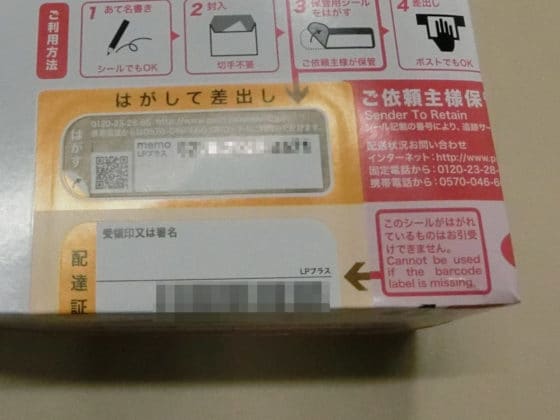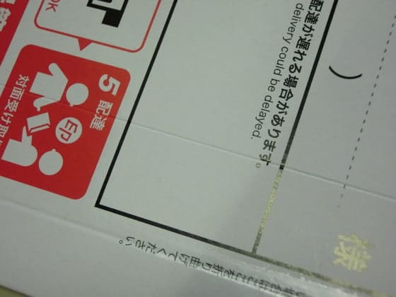 お届けの際は、箱に貼り付いている配達証を剥がして郵便局側が保管するのですが、この配達証が一部剥がれます。