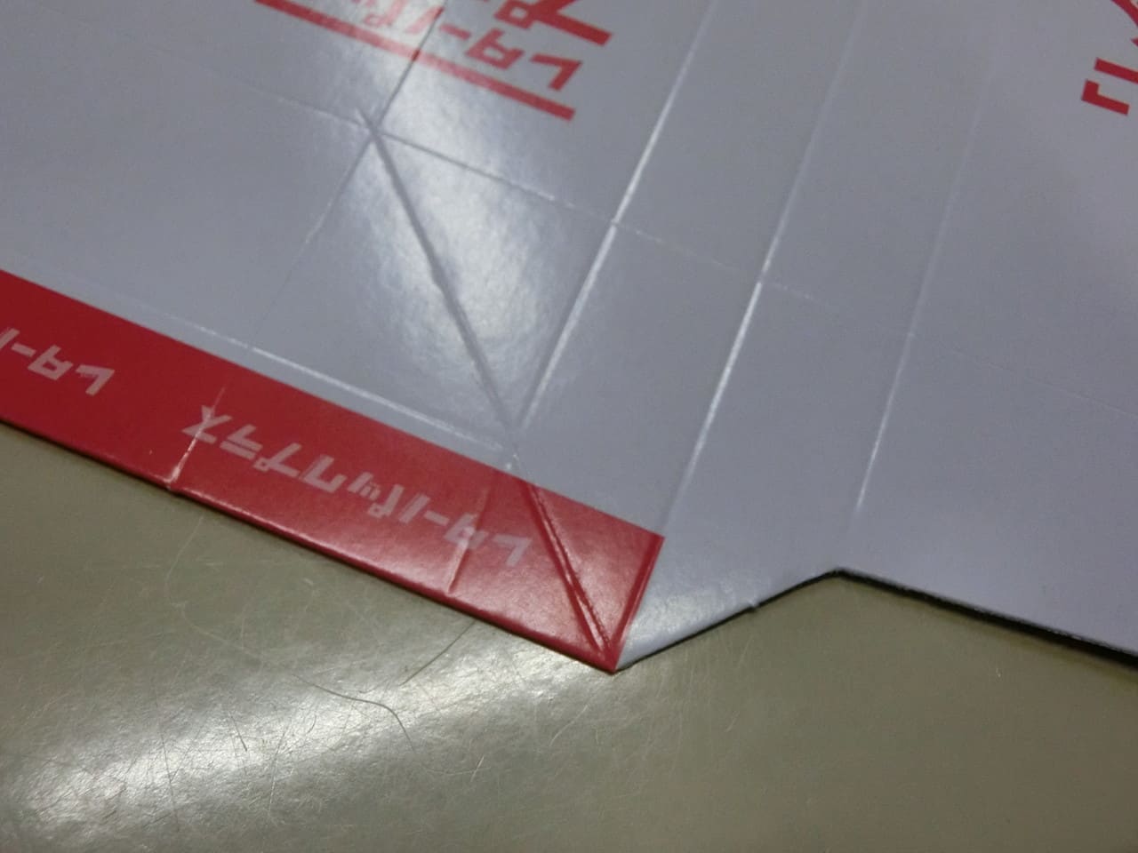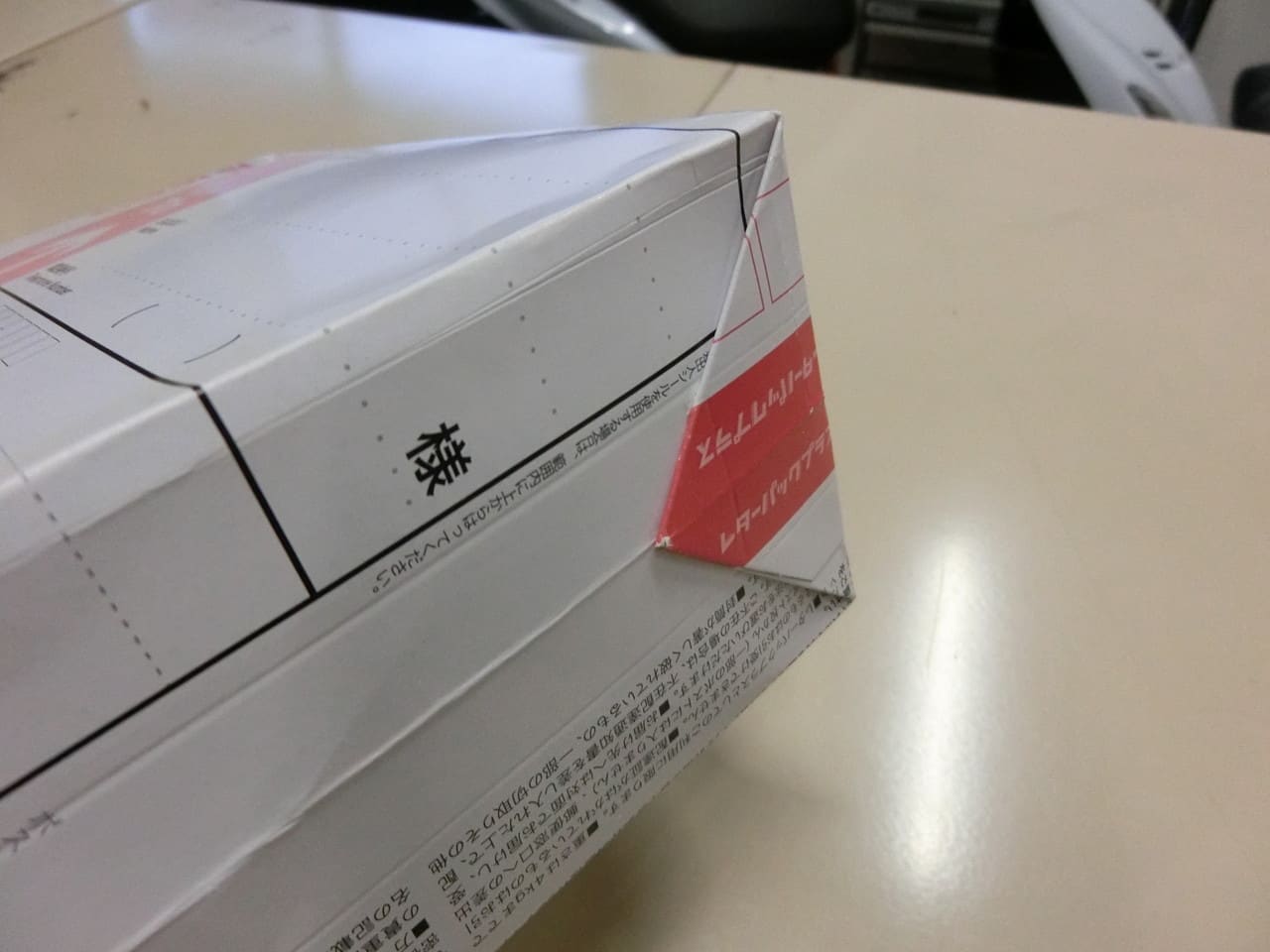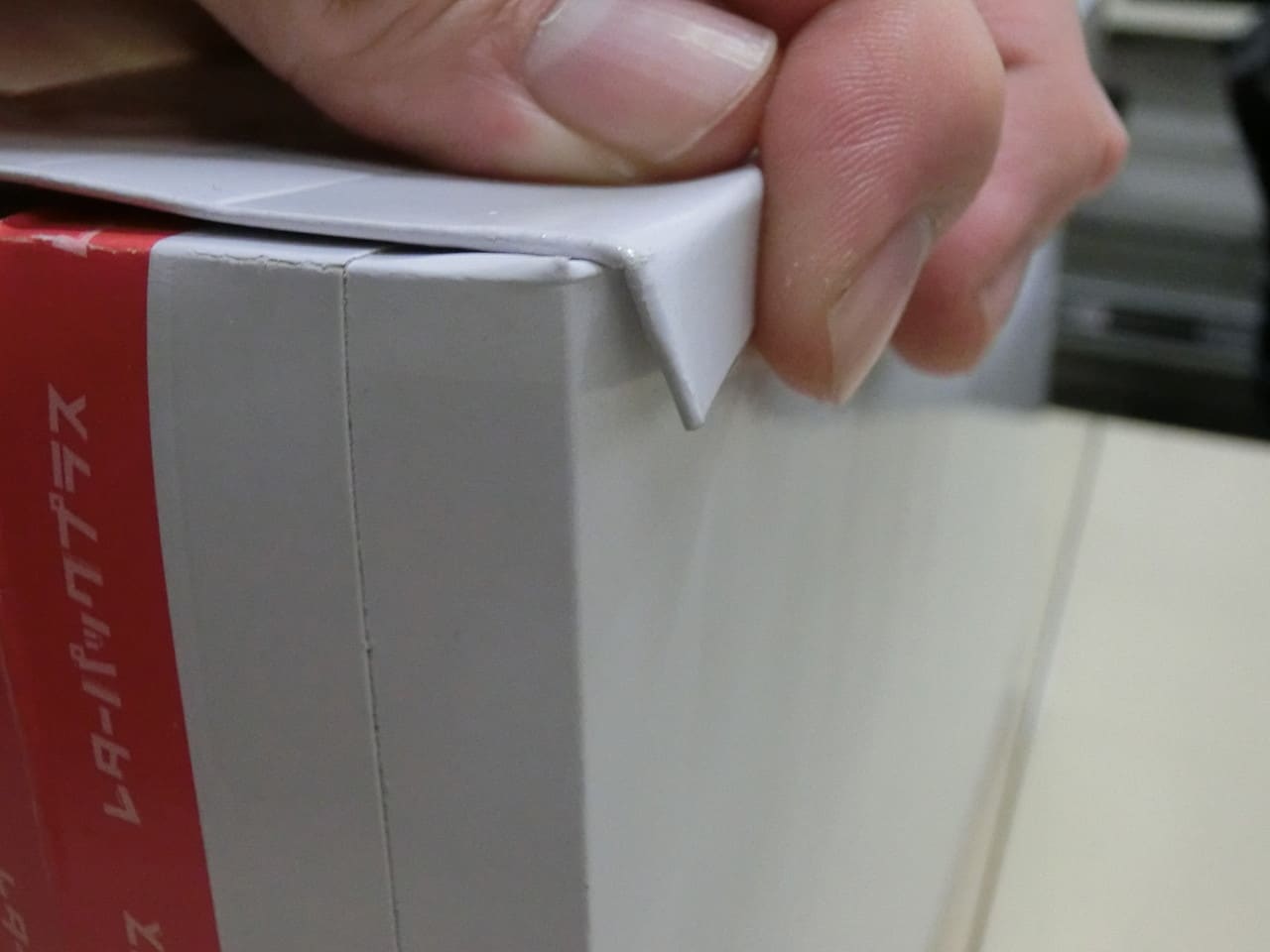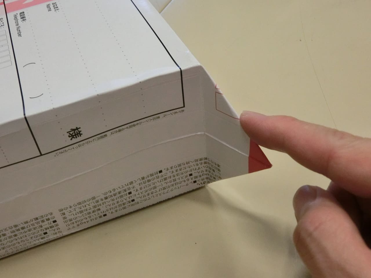 配達証は剥がしやすくなっているので、その部分で箱を折ると配達証の一部が浮いて剥がれやすくなるわけです。