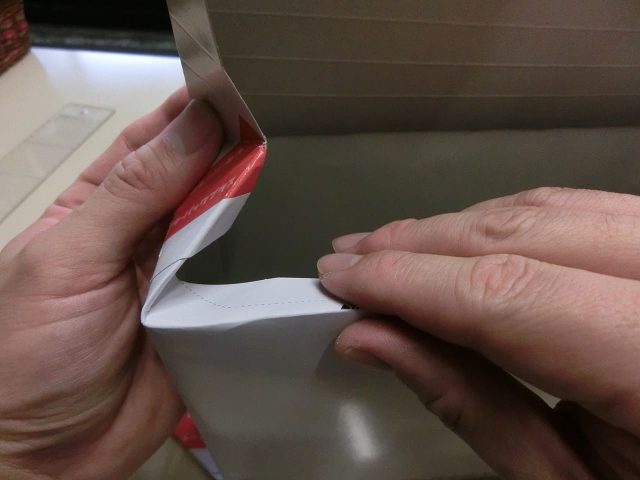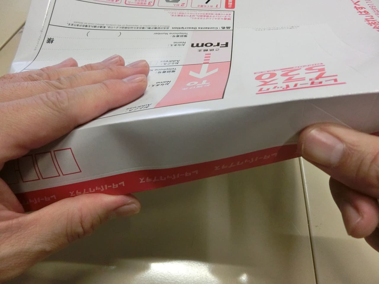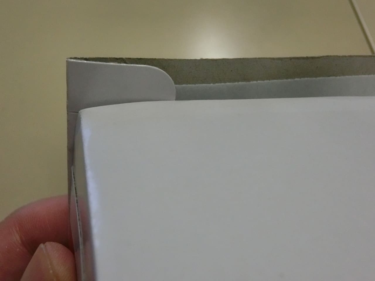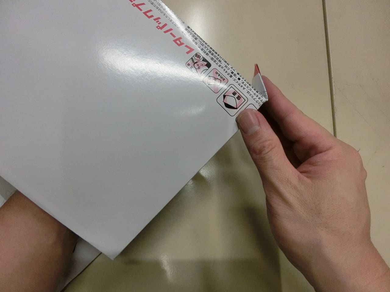 配達証は剥がしやすくなっているので、その部分で箱を折ると配達証の一部が浮いて剥がれやすくなるわけです。