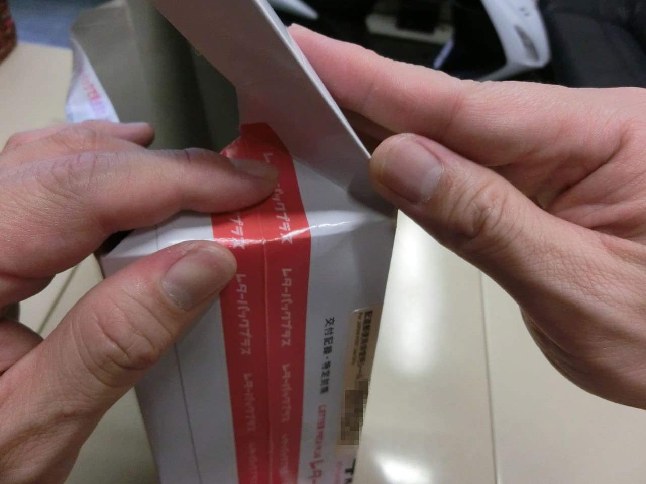 お届けの際は、箱に貼り付いている配達証を剥がして郵便局側が保管するのですが、この配達証が一部剥がれます。