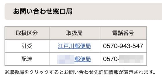 この場合は、そのステータスが書かれた少し下に「お問い合わせ窓口局」とありますので、取扱区分が「配達」の郵便局に電話して確認してください。