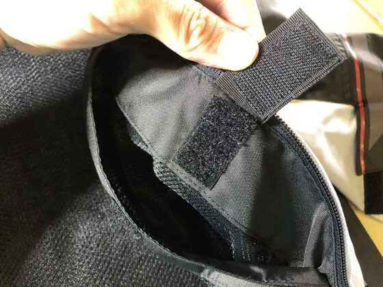 着るときに反対側のプロテクター用のポケットにも差し込むので、一度着てしまえばズレにくくなりますが、これでは、着るたびに落ちそうになります。